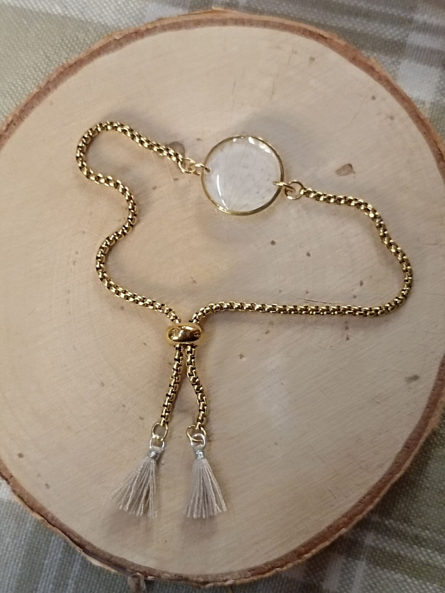 Bracelet avec pompons beiges et pétale blanc